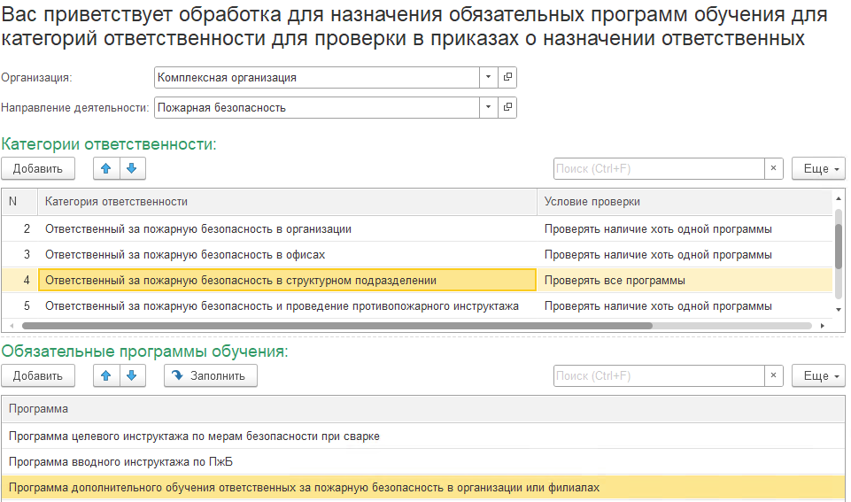 Обязательные программы обучения для каждой категории ответственности указываются с помощью специальной обработки. В верхней табличной части указывается категория ответственности, в нижней – перечень программ для нее.