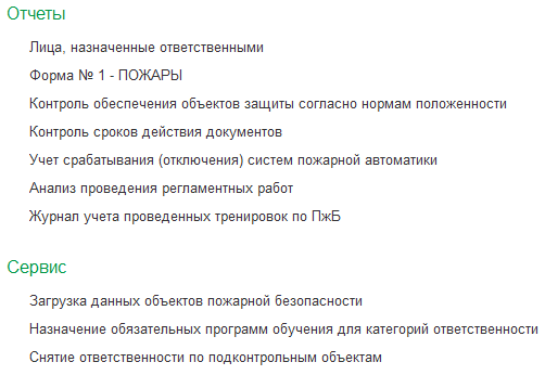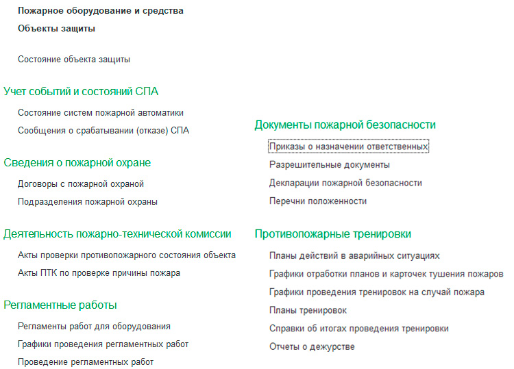В состав подсистемы "Пожарная безопасность" входит полный перечень справочников, документов и отчетов, необходимых для ведения мероприятий по обеспечению пожарной безопасности и выполнения требований приказа МЧС России №1120.