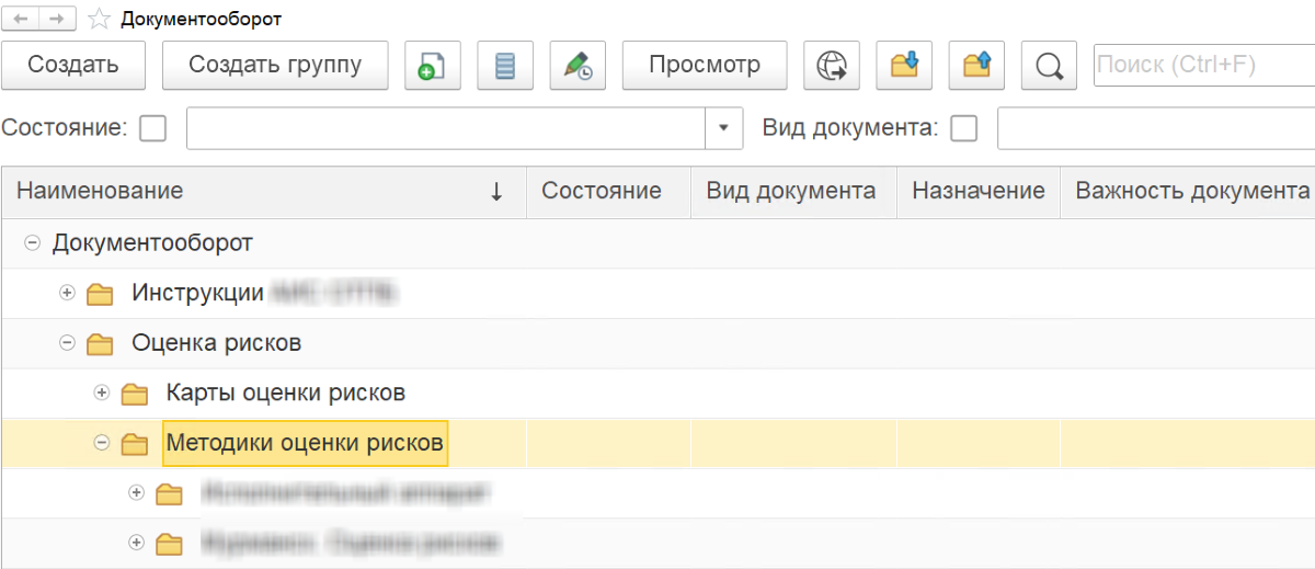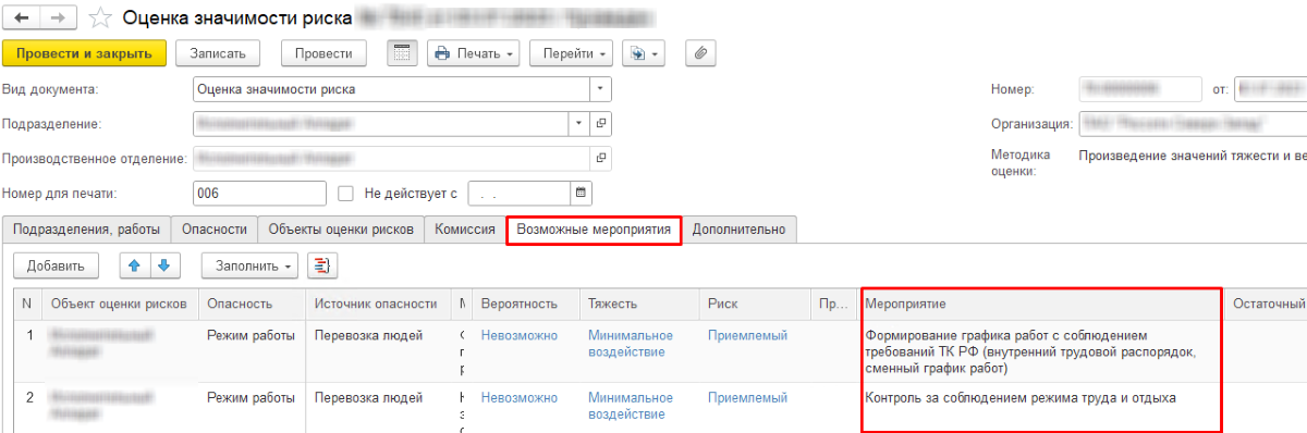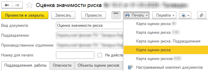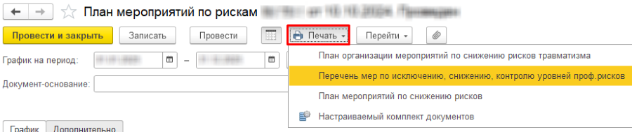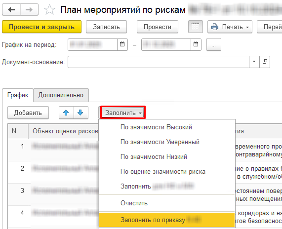 Поскольку у нашего заказчика используются собственные методики оценки рисков, мы разработали для них обработки автоматического заполнения документа "План мероприятий" и печатные формы.