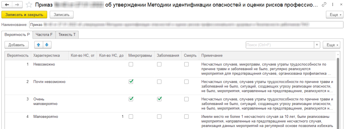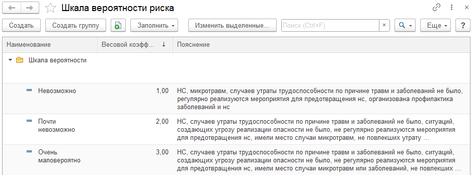 Типовой функционал СБОТ включает в себя справочник "Шкала вероятности риска", его значения были заполнены по разработанной в организации единой методике оценки рисков.