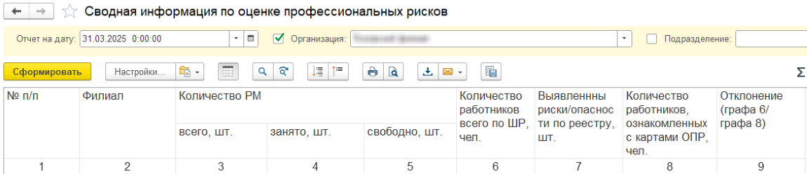 Отчет выводит сводную информацию по количеству рабочих мест, выявленных опасностей и количеству неознакомленных с картами оценки рисков.