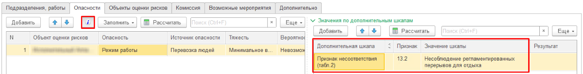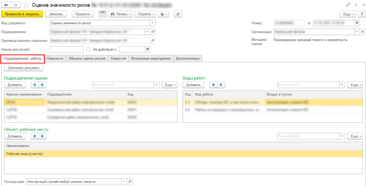 На закладке перечисляются все подразделения и виды работ, для которых производилась оценка рисков в карте;