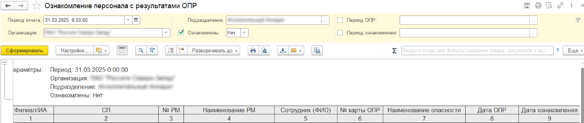 Контролировать ознакомление сотрудников с картами оценки рисков позволяет разработанный отчет "Ознакомление персонала с результатами ОПР".