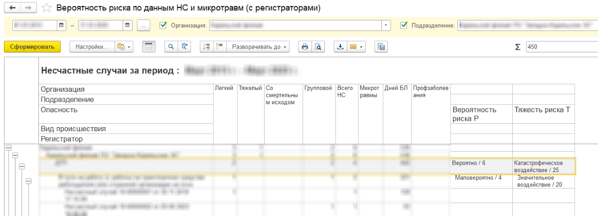 Для проверки корректности работы обработки и анализа травматизма разработан специализированные отчёт "Вероятность риска по данным НС и микротравм". В отчете выводятся данные с расшифровкой по первичным документам, составу выявления возможных опасностей, их вероятности и тяжести.