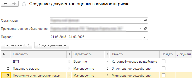 Специально разработанная обработка анализирует документы, соотносит их со значениями разработанного справочника и создает карты оценки рисков. Обработка также анализирует вид происшествия и соотносит его с наименованием опасности из методики.