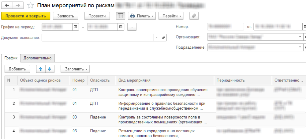 Перечень мероприятия в табличной части заполняется автоматически по кнопке "Заполнить". В документе можно откорректировать периодичность проведения мероприятий и указать ответственных.