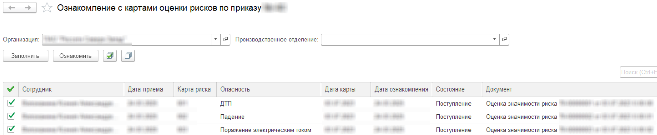 Отслеживать каждого такого сотрудника ради одной отметки в системе достаточно трудоемко, поэтому в ходе проекта была разработана групповая обработка "Ознакомление с картами оценки рисков по приказу":