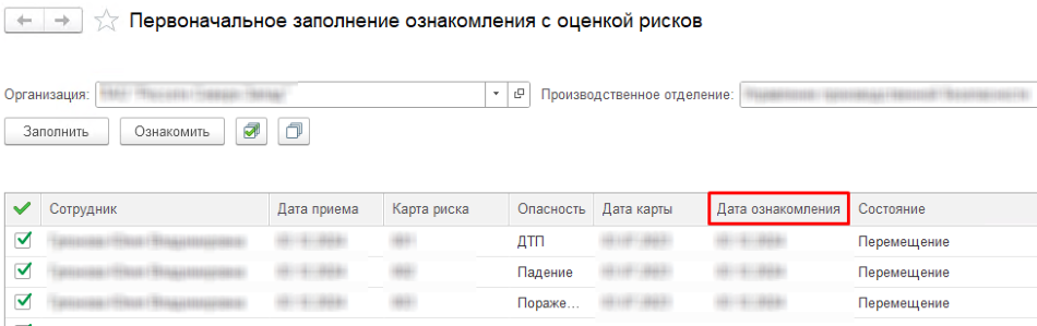 - В табличной части выводится дата изменения состояния сотрудника. Система предлагает ознакомить сотрудника с картами оценки рисков этой же датой. Если ознакомление произошло другой датой, то пользователь ее корректирует.