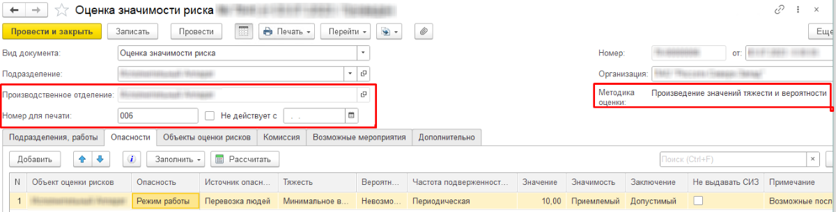Документ "Оценка значимости риска" может создаваться не только разработанной обработкой, но и пользователем вручную. В его табличной части указывается объект оценки, значения шкал тяжести, частоты и вероятности. Значения шкал, значимость и заключение рассчитываются системой автоматически.