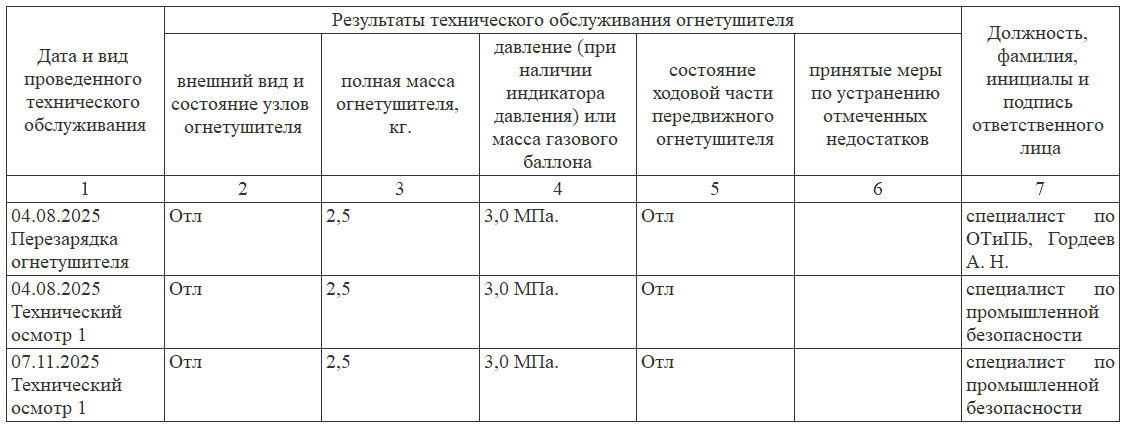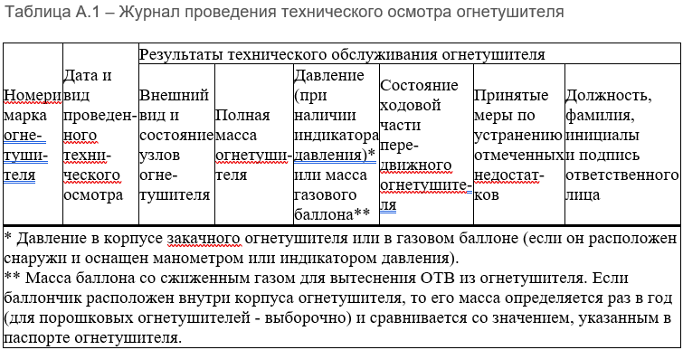 ГОСТ Р 59641-2021 содержит таблицу А.1 – "Журнал проведения технического осмотра огнетушителя". В данной таблице содержится перечень периодических мероприятий по техническому обслуживанию огнетушителей.