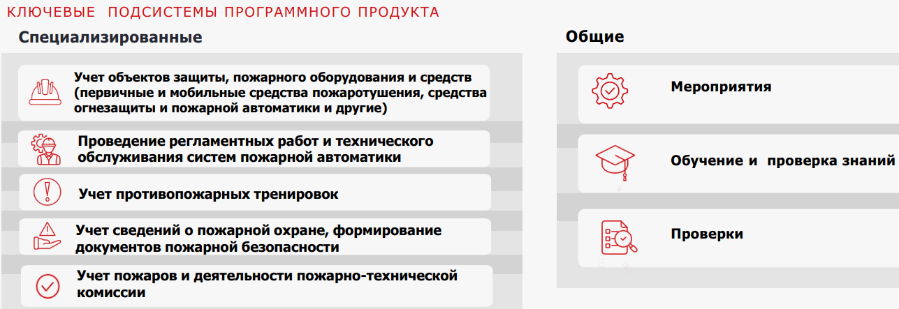 Программа "1С:Производственная безопасность. Пожарная безопасность" позволяет автоматизировать эту область учета в соответствии с актуальным ГОСТом. Решение включает набор подсистем для комплексного обеспечения и контроля мероприятий по пожарной безопасности.