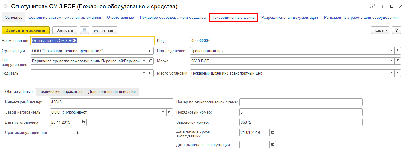 Возвращаясь к форме ввода и хранения данных огнетушителя, можно увидеть синюю гиперссылку "Присоединенные файлы". Программа позволяет хранить сканы различных документов, что упрощает систематизацию данных и оцифровку информации.