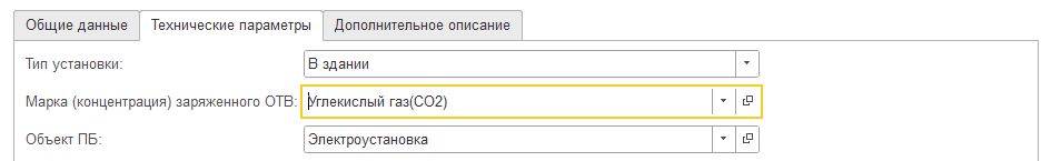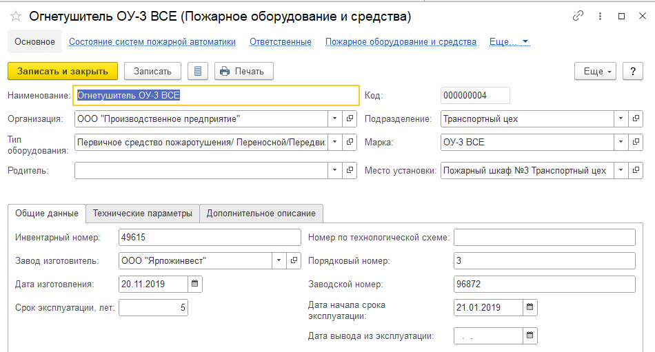 Ниже представлена форма карточки огнетушителя – элемент справочника "Пожарное оборудование и средства" системы "1С:Производственная безопасность. Пожарная безопасность".
