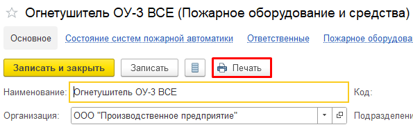 По кнопке "Печать" в системе формируется печатная форма карточки учета огнетушителя.