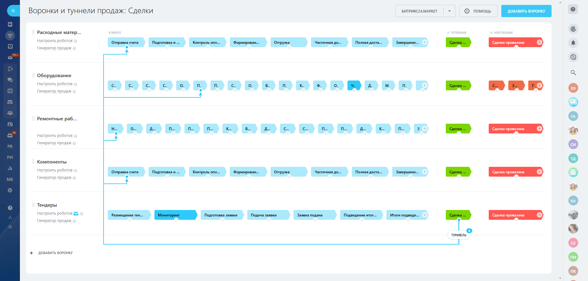 В сделках настроены воронки: расходные материалы, оборудование, ремонтные работы, компоненты и тендеры. Воронки друг от друга отличает этапность и автоматизация, которая реализована на уровне задач и уведомлений.