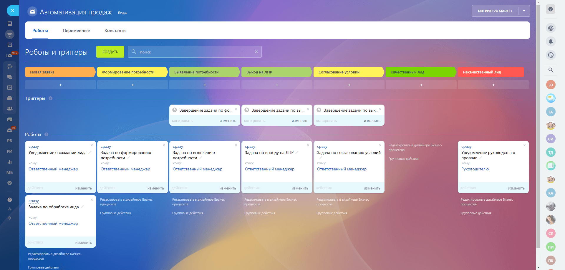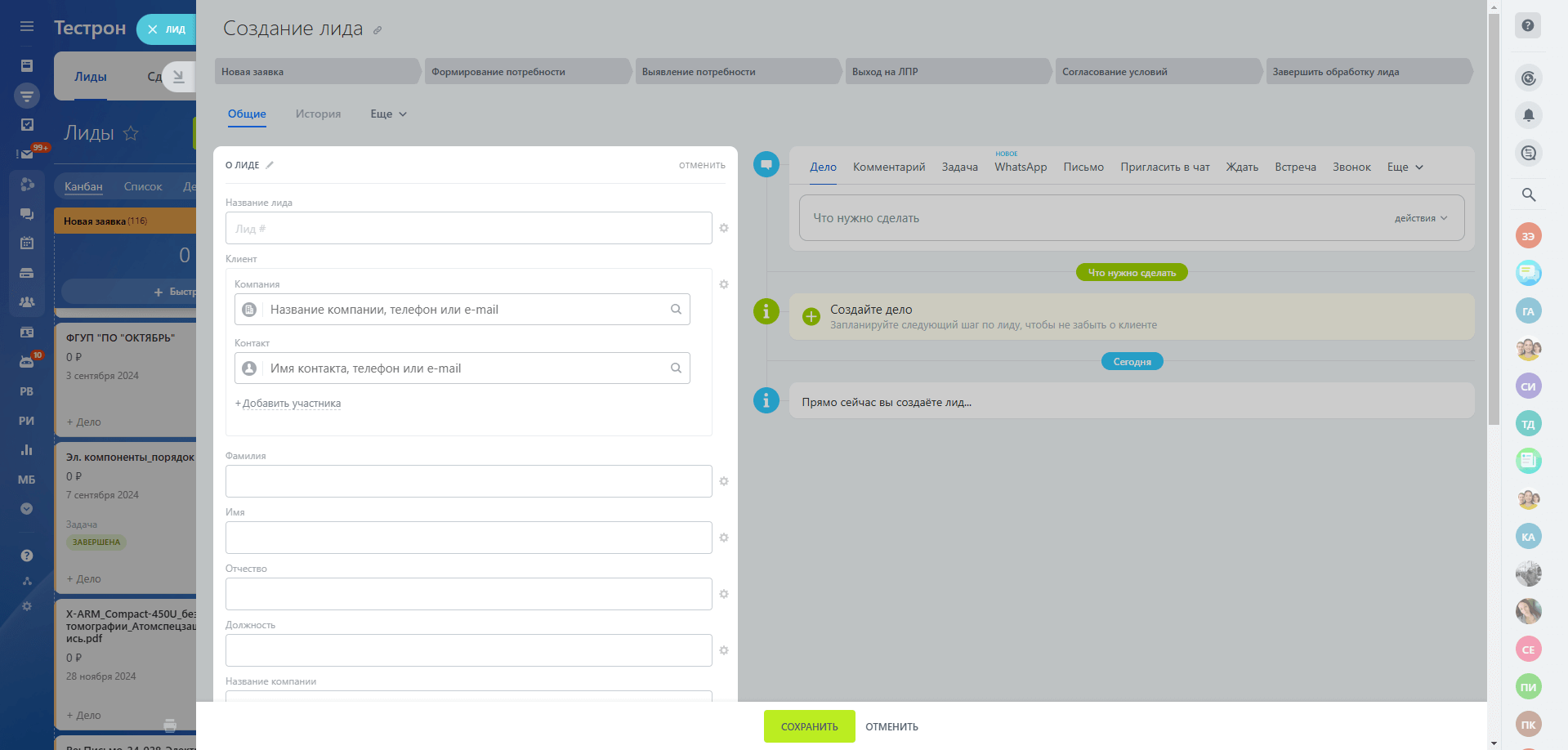 Лиды имеют следующие стадии, карточку и автоматизацию.