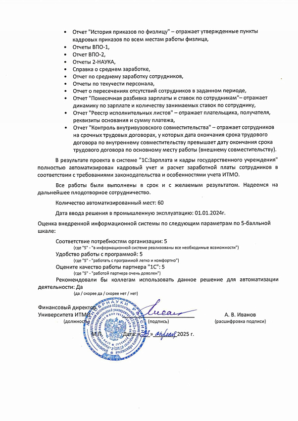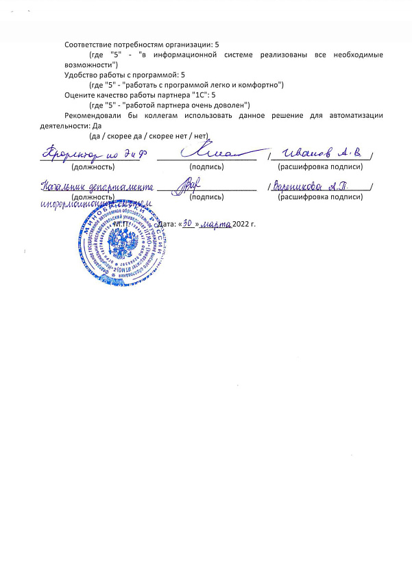 Системы на базе "1С:Предприятие" интегрированы в информационную среду Университета, обеспечена прозрачность и точность ведения учета по всем подразделениям благодаря доработанным аналитическим разрезам. Система Университета ИСУ получает необходимые данные в разрезе управленческих аналитик из систем 1С в полном объеме.