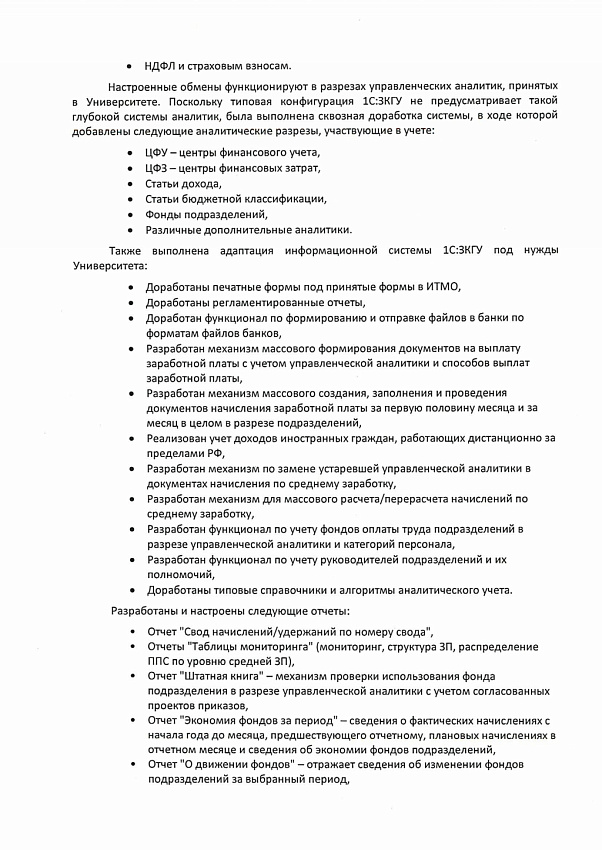 Между 1С:БГУ и ИСУ, 1С:ЗКГУ и ИСУ происходит обмен данными в разрезе принятых в Университете управленческих аналитик, которые участвуют в процессах учета бюджетов подразделений, учета образовательной деятельности, планировании закупок, кадрового учета и расчета заработной платы, а также в формировании отчетов. Поскольку типовые конфигурации 1С:БГУ и 1С:ЗКГУ не предусматривают такой глубокой системы аналитик, была выполнена сквозная доработка систем, в ходе которой добавлены следующие аналитические разрезы, участвующие в учете: