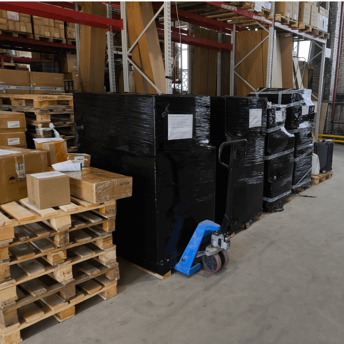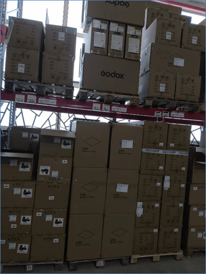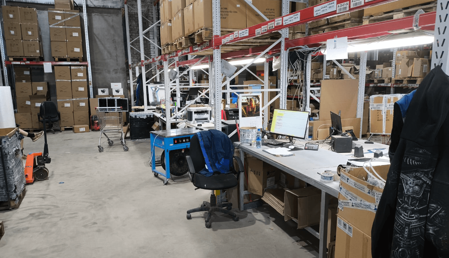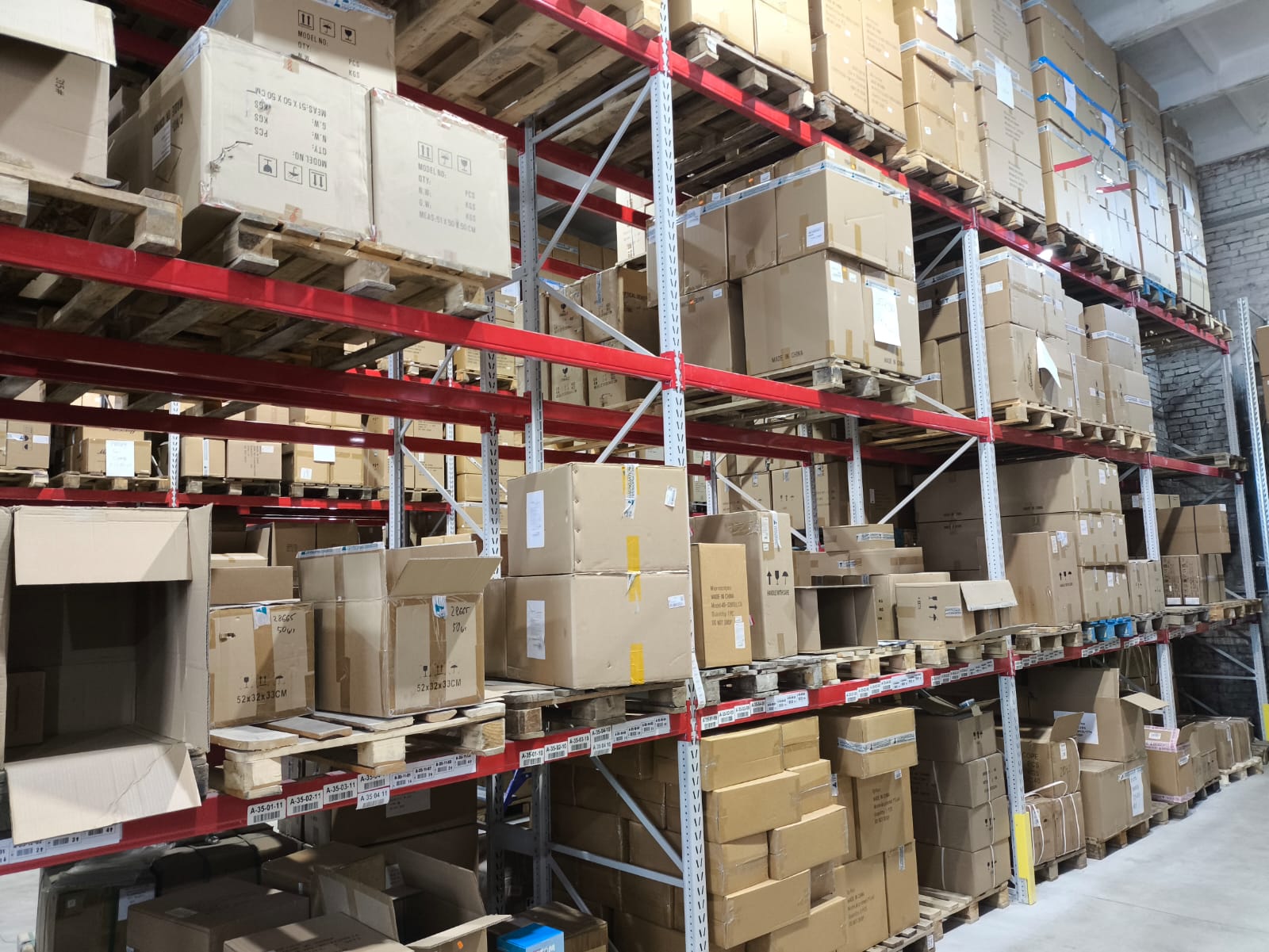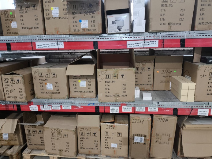 Основной тип хранения – грузовые фронтальные стеллажи, полочное хранение коробок и упаковок;