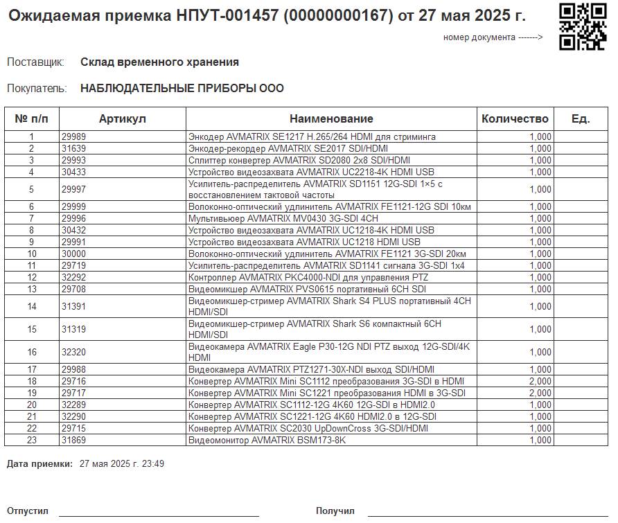 Доработан лист приемки товаров на склад
