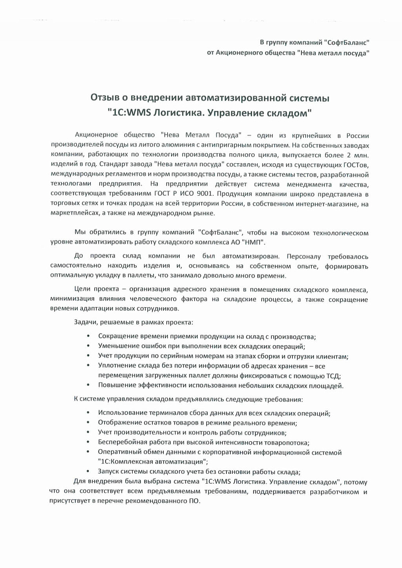При выборе складской системы руководство компании "Нева металл посуда" провело мониторинг рынка логистики и, по его итогам, остановило свой выбор на предложенном специалистами ГК "СофтБаланс" варианте внедрения WMS на базе программного продукта "1С:Предприятие 8. WMS Логистика. Управление складом 5.1", так как он отвечал всем предъявляемым требованиям.
