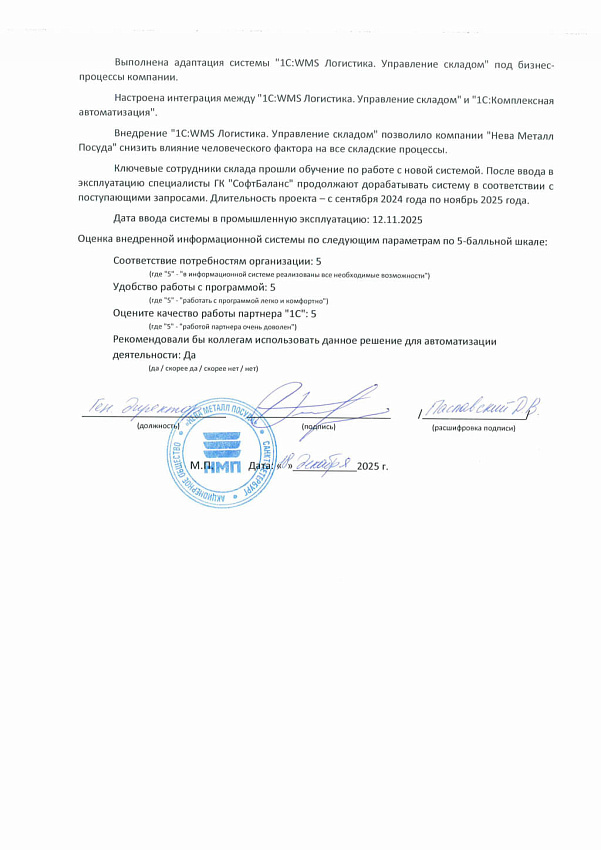 После ввода в эксплуатацию, АО "НМП" продолжает сотрудничать со специалистами ГК "СофтБаланс" и дальше совершенствовать систему управления складом.
