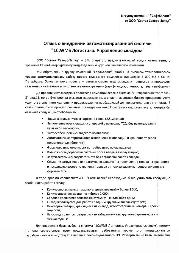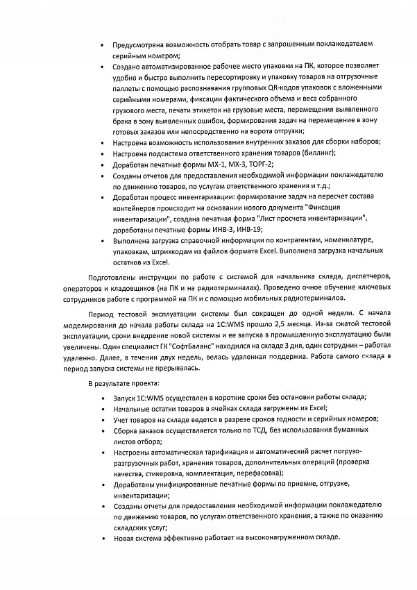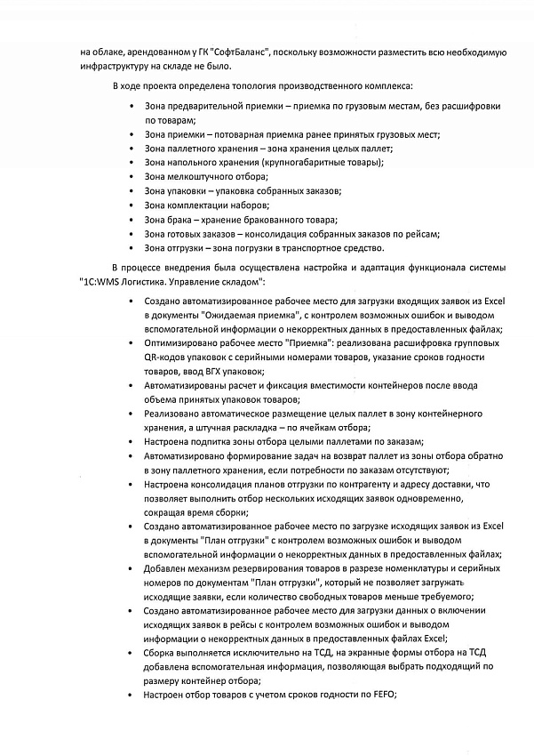 В результате внедрения на складе "1С:Предприятие 8. WMS Логистика. Управление складом" редакция 5.1.4.5, цели проекта были достигнуты, все поставленные перед специалистами ГК СофтБаланс задачи решены: