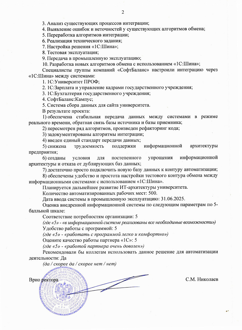 Для автоматизации деятельности в Университете используется большое количество разнообразных систем и сервисов, в том числе системы на базе "1С:Предприятие". Для того, чтобы обеспечить стабильный и оперативный обмен данными, было задействовано серверное решение класса ESB "1С:Шина". В результате конкурса был определен поставщик услуг – группа компаний "СофтБаланс" – официальный партнер фирмы "1С", обладающий проектным опытом в данной области.