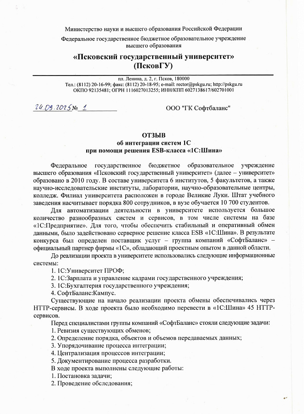 Интеграции систем 1С через 1С:Шина во Псковском Государственном Университете