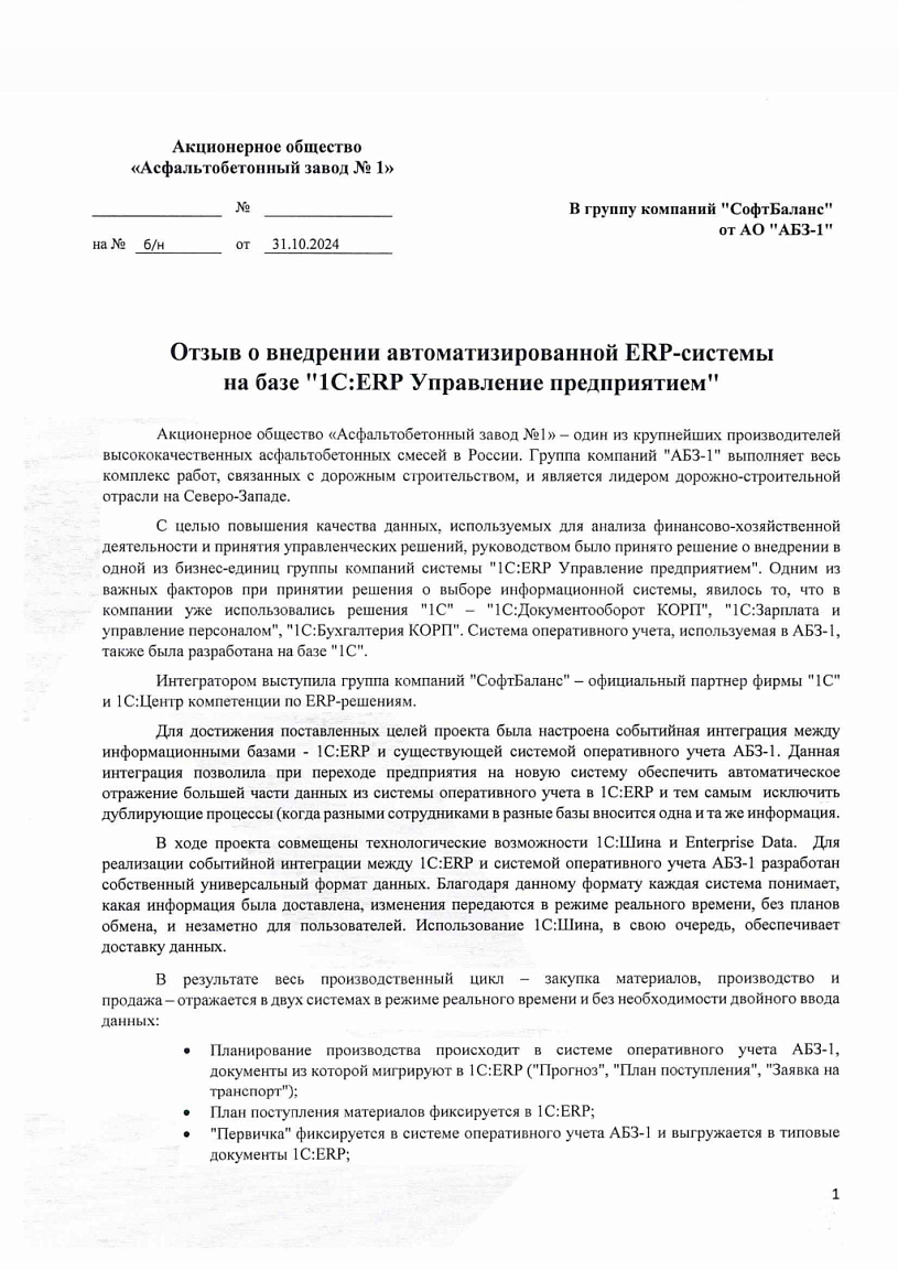 С целью повышения качества данных, используемых для анализа финансово-хозяйственной деятельности бизнес-единиц группы компаний и принятия управленческих решений, руководством АБЗ-1 было принято решение о внедрении системы "1С:ERP Управление предприятием". Важную роль при выборе системы сыграло то, что в компании уже использовались решения "1С" – "1С:Документооборот КОРП", "1С:Зарплата и управление персоналом", "1С:Бухгалтерия КОРП". Система оперативного учета, используемая в АБЗ-1, также была разработана на базе "1С".