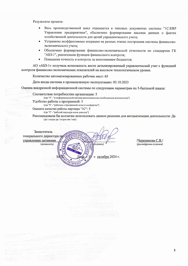 Обеспечено формирование финансово-экономической отчетности по стандартам ГК "АБЗ-1", реализована функция финансового контроля;