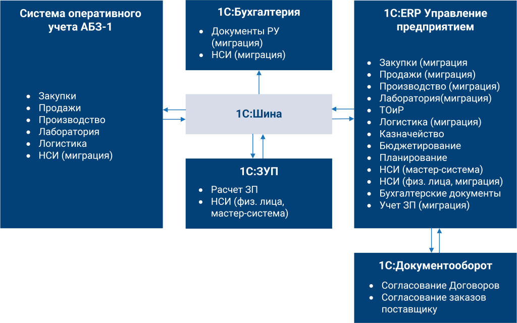 В ходе проекта совмещены технологические возможности 1С:Шина и Enterprise Data без использования ETL-модуля. Написан собственный универсальный формат данных на базе конфигурации 1С:Конвертация данных 3.0, сообщения внутри систем унифицированы. 1С:Шина выступает в роли транспорта и гарантирует доставку сообщений.