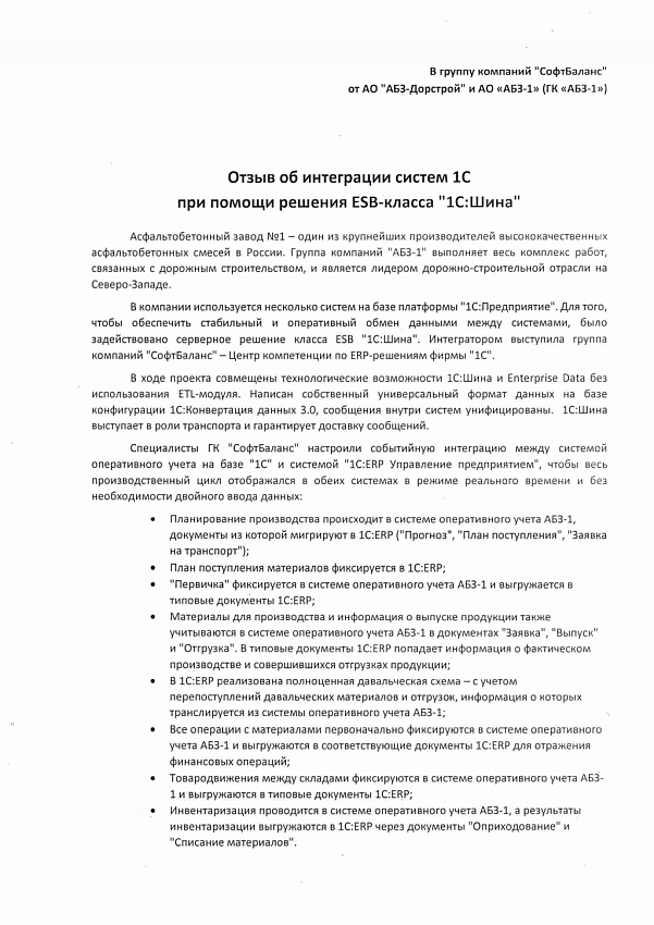 В 1С:ERP реализована полноценная давальческая схема – с учетом перепоступлений давальческих материалов и отгрузок, информация о которых транслируется из системы оперативного учета АБЗ-1;