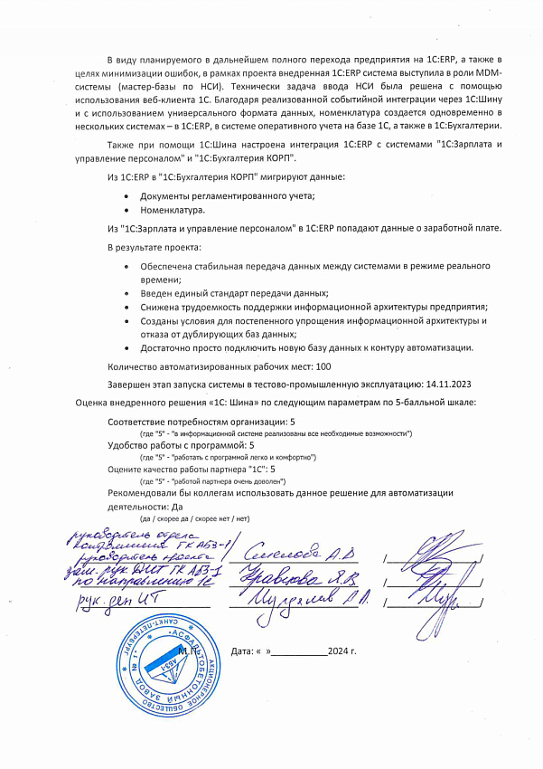 Также при помощи 1С:Шина настроена интеграция 1С:ERP с системами "1С:Зарплата и управление персоналом" и "1С:Бухгалтерия КОРП".