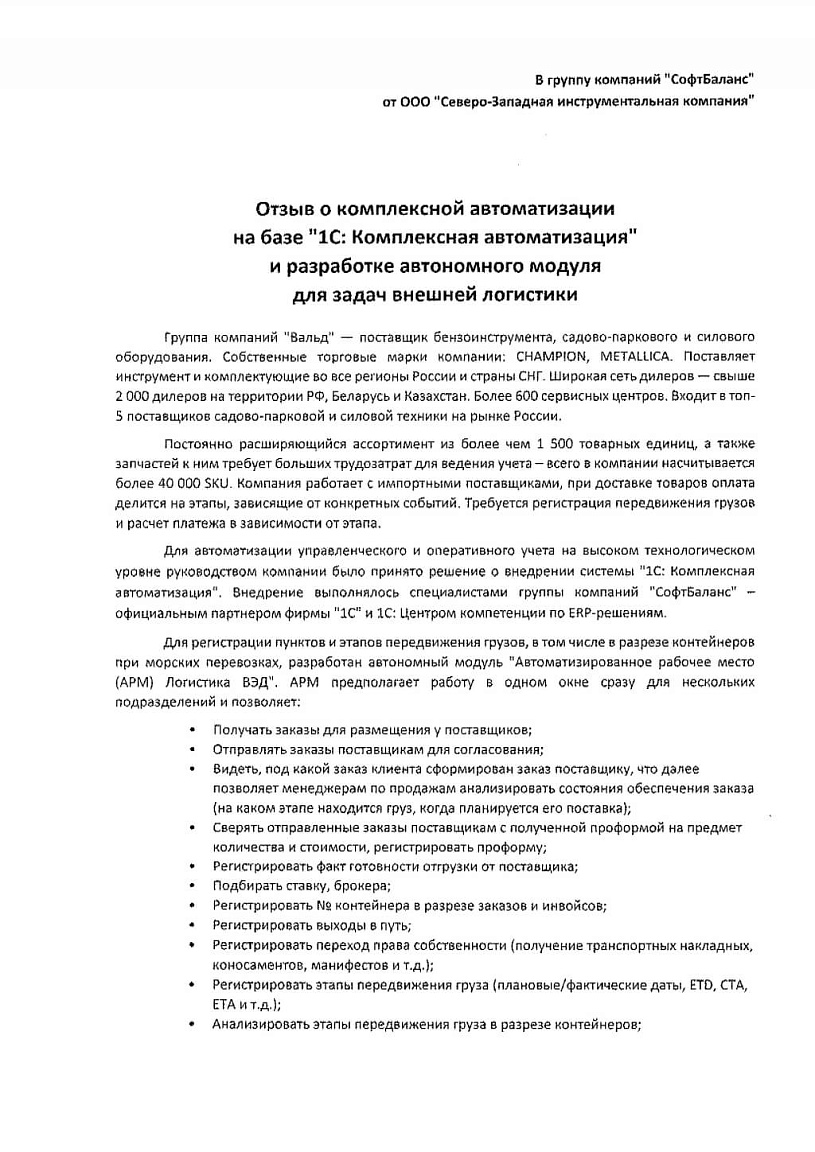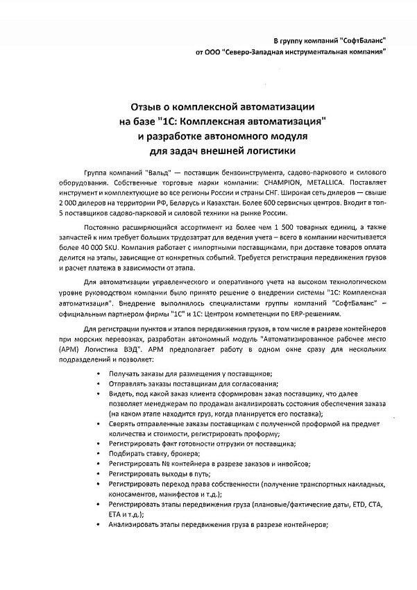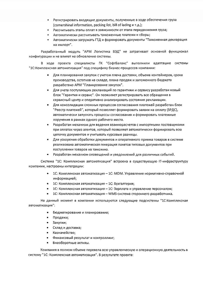 В ходе проекта специалисты ГК "СофтБаланс" выполнили адаптацию системы "1С:Комплексная автоматизация" под специфику бизнес-процессов компании: